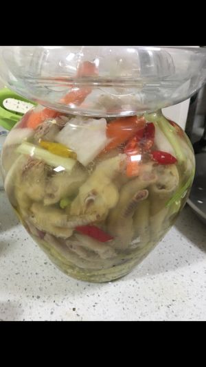 加矿泉水或者纯净水进去 把切好的红白萝卜和芹菜段鸡爪一起放坛子就好了
