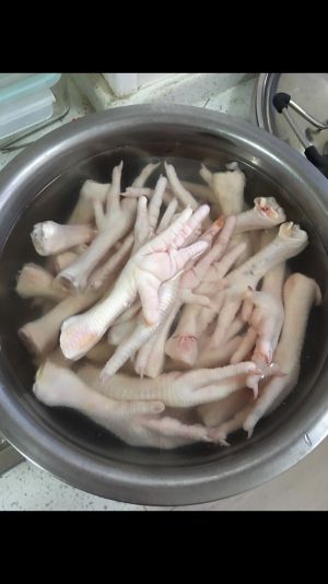 鸡爪买回来 剪去脚指甲 用清水泡二十分钟 泡出血水后 下锅加料酒姜片煮大概八分钟 出锅立即用冰水反复冲几分钟 这样鸡爪比较筋道 这个步骤比较关键不要大意哦