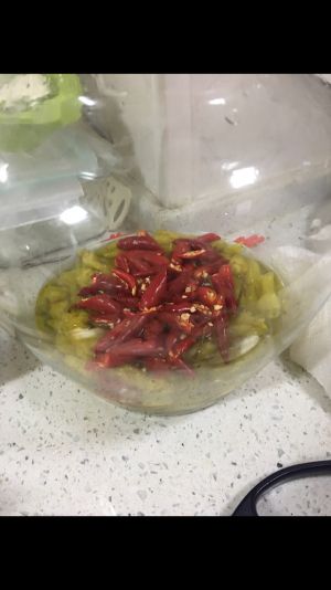 把所有食材全都放盆里,不用分先后顺序,野山椒放最上边。