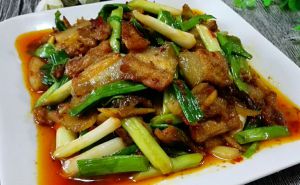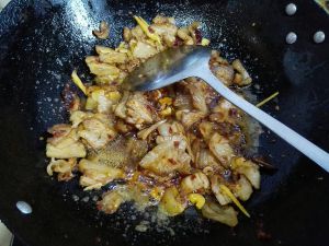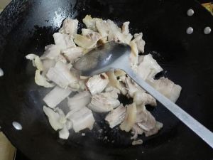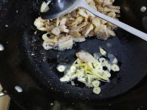 炒至肥油出,肉片边缘卷曲,变黄有香味飘出时,把它扒到锅边,下入姜蒜炒香。