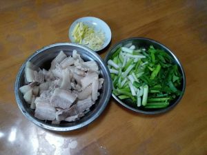 五花肉去皮切薄片(当然也可不去皮,随各人爱好),姜切丝,蒜切片,青蒜择去黄叶,斜切小段,蒜白和蒜叶分开放。