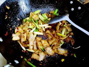 锅中放入回锅肉将油炒出,然后加入豆瓣酱姜蒜白糖酱油,充分翻炒,再加入苕皮和青椒。