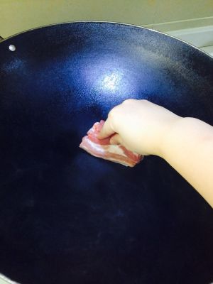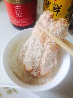 把肉两面都粘上米粉,先把腌肉时用的配料挑出来不要