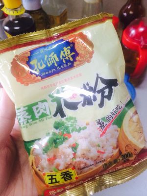 五花肉切成薄厚均匀的片,带皮的五花肉哟,然后放料酒,五香粉,少许的盐鸡精,我用的是老抽,生姜,我忘记放糖,还有一点一点点的豆腐乳块,少许的豆瓣酱豆瓣酱要炒熟再来一点香油,然后腌半个小时左右,好了之后放蒸肉粉再拌上,可以稍微加一点水,不能太干,