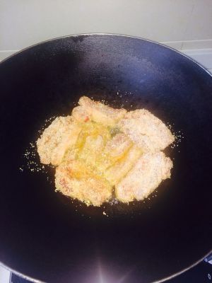 锅内倒入200毫升油大火烧开,用筷子把肉夹起放入锅里煎至两面呈金黄色即可出锅