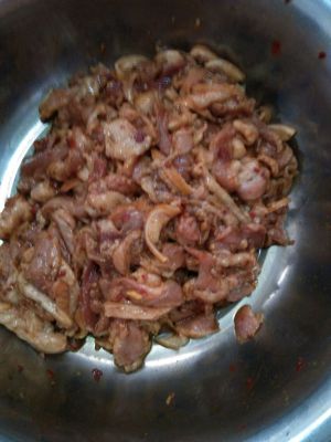 将买好的的五花肉切片放入姜蒜末 胡椒粉 花椒面 生抽 老抽 料酒 盐 鸡精适量加拌均匀并腌制一会入味