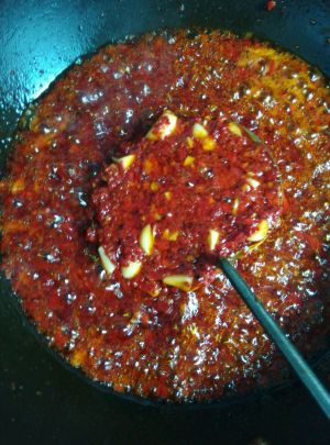 把糍粑辣椒和蒜半倒入炒鸡的油中,不断翻炒,直至看到辣椒皮卷起。