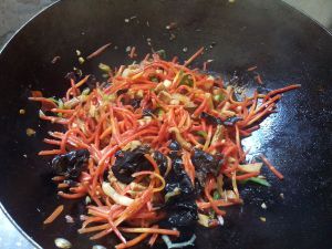 放入郫县豆瓣炒香,倒入胡萝卜,木耳,尖椒,葱丝,翻炒