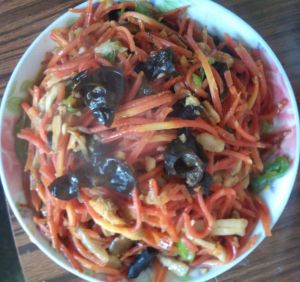 把切好的菜丝放入锅内,待胡萝卜丝炒软倒入调好的汁,炒匀放入肉丝,尝一下味道,喜欢口重的可以加入少许盐,炒匀加入鸡精翻炒后出锅