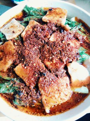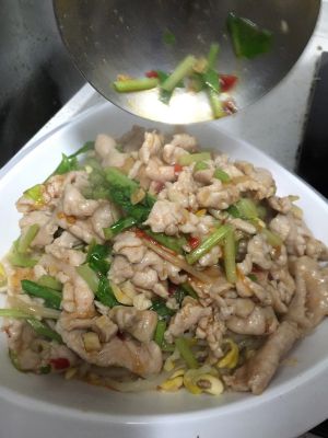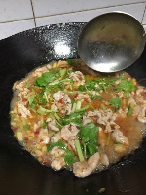 将锅里的肉片连同汤水倒入刚刚的汤碗里即可。喜欢吃辣的朋友可以将前面爆香过的辣椒段捣碎放到汤碗里,然后再加热少许食用油或者香油,趁热泼到辣椒碎上即可,这样更香辣。