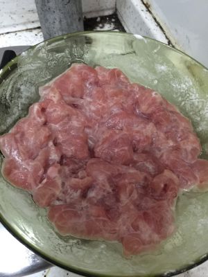 肉切片,加淀粉加水,加少许盐码上,备用