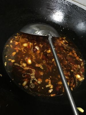 葱姜蒜花椒大料烹锅调味加滑肉高汤,铺第四层辣椒麻椒料,