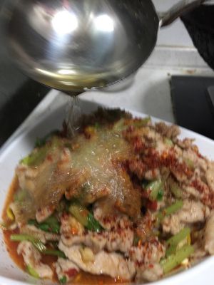 将热油烫在上面,把花椒辣椒的香气都烫出来