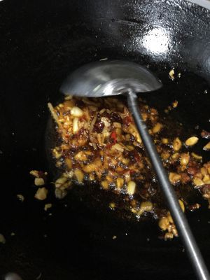 再将郫县豆瓣酱加入锅里翻炒出红油,加入葱姜末爆香
