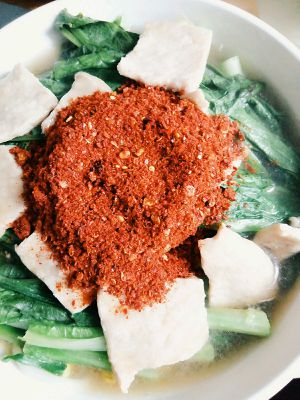 下锅来不及拍了 肉片下锅不要搅动,默默数10秒就行了 捞起来摆在蔬菜上,淋点汤汤 铺起海椒面,胡椒面