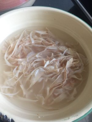 墨鱼丝撕小条浸泡2小时左右。