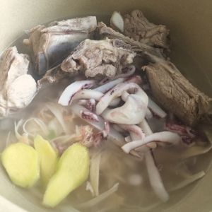 将煮好的排骨块和姜片,墨鱼丝,鲜鱿鱼条一同放进瓦罐中加水,注意如果喜欢鲜美的口感,可以把浸泡墨鱼丝的水一同倒进瓦罐。