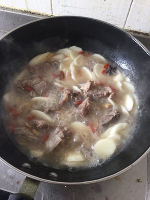 滴入半汤勺的醋,加入切成滚刀状的山药,适量的枸杞,转小火炖10到15分钟