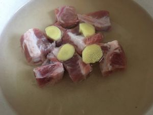 排骨过下水,捞起。