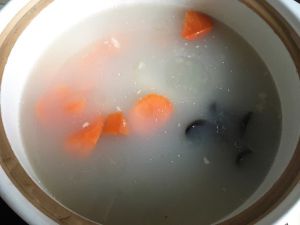 用筷子戳入排骨中感觉炖烂就将山药、胡萝卜和黑木耳放入锅内开大火烧15分钟;