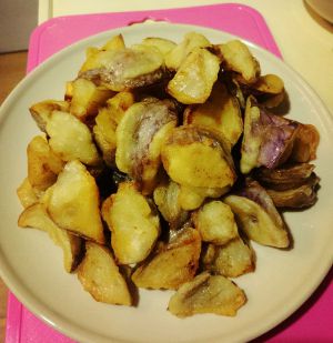 油温到8成热,茄子挂胡下锅炸至金黄<里面软外面脆>,炸的时候注意小火翻面,控油捞出,待冷却再滚油复炸一遍,防止茄块软化