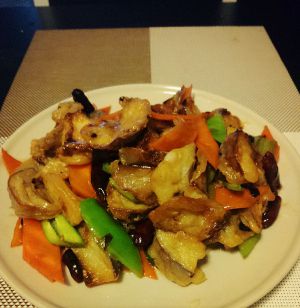 少许油加热,放姜块 胡萝卜片 尖椒片炒香,待香味出来下茄子,加少许酱油,盐,鸡精,翻炒一分钟,放入蒜泥拌匀,关火出锅