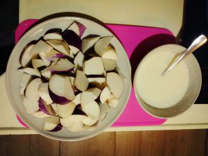 茄子洗净切滚刀块备用,面粉加水,少许盐,少许糖,搅拌均匀至粘稠状<用勺子舀起来会顺滑流下去不会粘在勺子上就行>