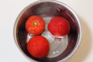 在西红柿上划十字花刀,然后放进开水中,去皮备用。