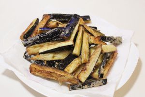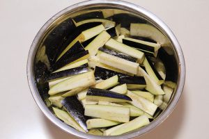锅中加入适量的油,油热后将茄条依次放入锅中煎炸至表面微黄后盛出备用。
