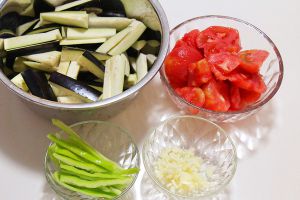 将茄子切成约七八厘米的长条、蒜切末、西红柿切块、辣椒切细条备用。