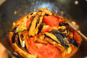 最后将茄子也倒入一起翻炒至熟,盖上锅盖一段时间,最后记得放入盐适量即可。