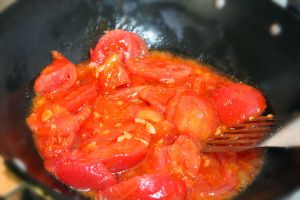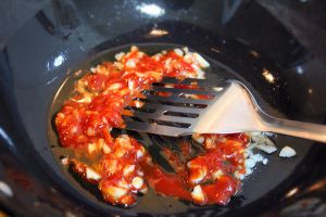 锅中留适量的底油,然后油热后,加入蒜末煸炒出香,然后再倒入番茄酱煸炒匀均。