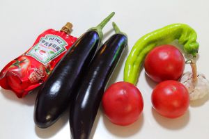 准备食材。长茄子两个、西红柿三个、辣椒一个、蒜适量。调味料:番茄酱适量、盐2小勺、糖2勺、生抽2勺、鸡精1小勺、香油适量、玉米淀粉适量。