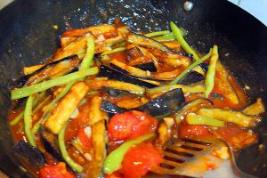 一直烧到茄子变软,放入青红椒红、大蒜及调料,炒到青红椒断生即可。