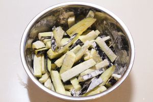 茄子腌好后,将盆里多余的水去掉。然后撒适量的干玉米淀粉拌匀备用。