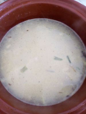 将烧开的汤倒入砂锅或者电饭煲内,加点料酒,按下开关。