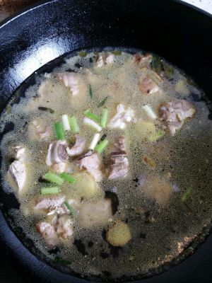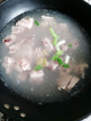 锅内放水,排骨下锅,放入葱姜,少量料酒,大火烧开。