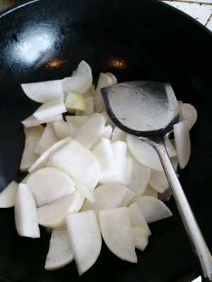 将锅内放油,烧热,放入萝卜,翻炒几下,稍微变色即可。这样汤会更香。