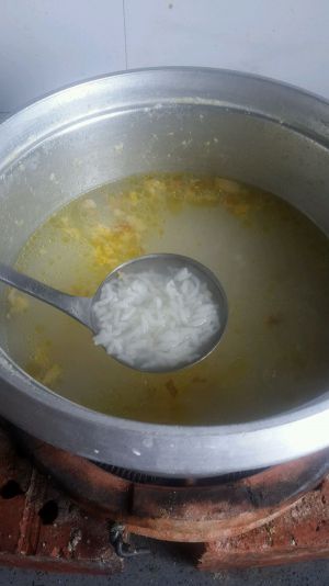 米煮开花后放鸡肉和雷公根煮熟,调味,就可以了!!