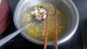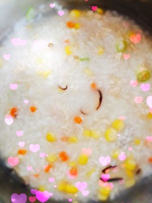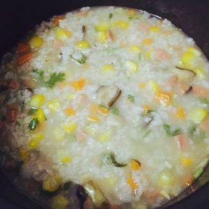 粥煮到图一的程度,放入所有焯好水的食材(我把姜挑出去了),再放入适量玉米粒,熬煮片刻就可以出锅啦!