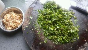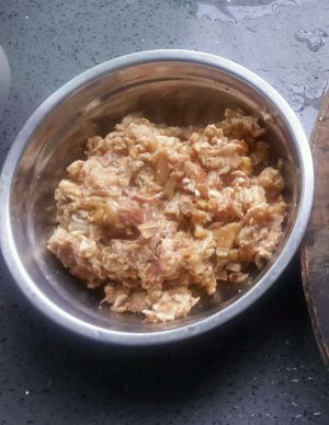 鸡肉剁碎,加姜,酒,酱油,腌制