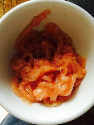 鸡肉切丝,加一小勺盐,胡椒(黑白都可),淀粉腌制。