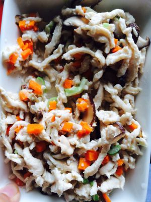 锅中烧少量水,放入刚刚切好的所有材料,胡萝卜,鸡丝,葱姜,香菇。煮熟后盛出备用,