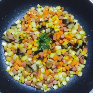平底锅放油,倒入香菇火腿先炒一小会,加入生抽,一点醋,然后把胡萝卜跟玉米倒入一起炒。