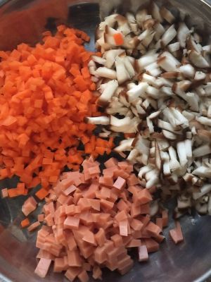 把胡萝卜,火腿,香菇切成丁备用
