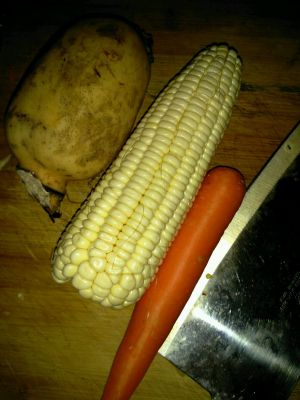 倒入一小勺醋(让排骨里的钙更容易被人体吸收),水开后,胡萝卜藕滚刀,玉米切块放入锅内