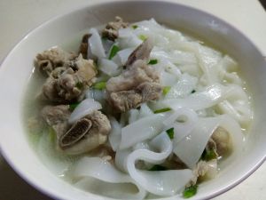 锅重新洗净,放入适量水(此时水可多放,因河粉易吸水),倒入排骨,大火煮开后,中火煮三十至五十分钟,然后倒入少量醋煮五分钟,去腥。