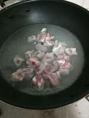 排骨焯水,去掉血沫。放电饭锅里,加姜片,葱段,一次性加入需要的水量(建议多加些,煲的时间长,水分消耗大)