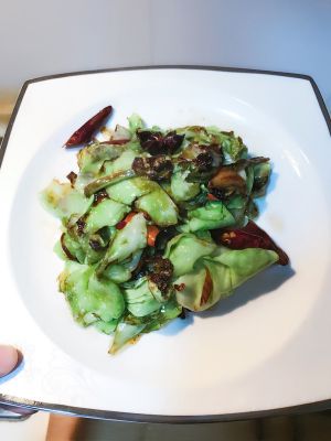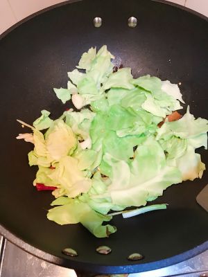 大火快速煸炒包菜,加入一点盐、味事达生抽调味,这道菜的精华部分就是香,放了酱油需要不断翻炒,焦香味慢慢出来就可以起锅了。