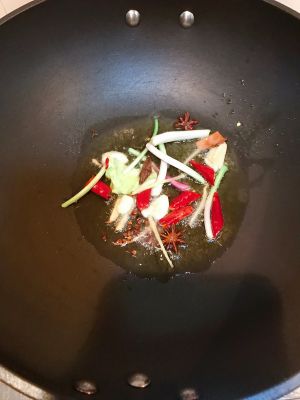 油热后,把小料炒香,20秒左右即可,不要炒太久。